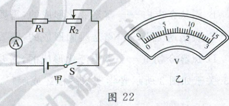 (2)将一个表盘如图22乙所示的电压表接入电路。当电压表并联在某个元件两端时,移动滑片过程中电压表示数的最小值为8V;当电压表并联在另一个元件两端时,移动滑片过程中电压表示数的最小值为4V。求滑动变阻器R₂的规格。