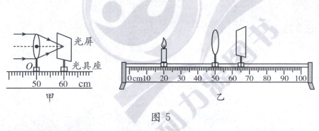 8. 如图5所示,利用图甲来测量凸透镜的焦距,利用图乙来探究凸透镜成像的规律,当蜡烛在图乙位置时,光屏上恰好成清晰的像,下列说法正确的是(