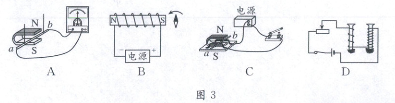 6. 乘坐地铁要进行安检。进站安检时,当金属探测仪靠近金属物体,会产生感应电流,发出警示信号。如图3中与其工作原理相同的实验装置是(