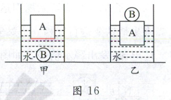 19. (6分)如图16甲所示,放在水平桌面上底面积S₀=0.02m²的柱状容器盛有水,木块A漂浮在水面,实心球B浸没在水中。已知球的重力G_B=4N,体积V_B=2×10⁻⁴m³。(g取10N/kg,水的密度ρ_水=1.0×10³kg/m³)