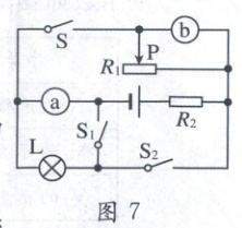 10. 如图7所示电路图中,电源电压不变,小灯泡L标有“6V 3W”字样,R₁为滑动变阻器,定值电阻R₂=24Ω,a、b一个为电流表另外一个为电压表。当只闭合开关S且移动滑片P的位置时,两电表示数都会发生变化;当只闭合开关S₂时,小灯泡恰好正常发光,此时电路消耗的功率为P₁,下列说法正确的是(