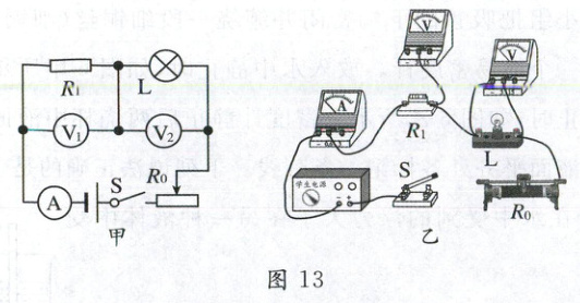 18. (7分)小明设计了如图13甲所示的电路图“探究电流与电压的关系”。电源电压为6V且保持不变,灯泡L标有“2.5V 0.3A”,R₁的阻值为5Ω,R₀为滑动变阻器。