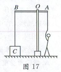 19. (6分)健身房中,人们利用杠杆向上提拉锻炼身体,其简化装置如图17所示,O为杠杆支点,已知OA:OB=1:3,配重C受到的重力为500N,与地面的接触面积为4×10⁻²m²,当锻炼人员在A端施加竖直向下600N拉力时,不计杆重、绳重及转轴处的摩擦。求: