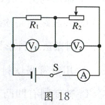 20. (6分)如图18所示电路,电源电压不变,R₁是定值电阻,滑动变阻器R上标有“50Ω 2A”字样,电流表的量程为0~3A,两电压表的量程均为0~15V。闭合开关,当滑片置于最右端时,电压表V₁的示数为3V,电流表的示数为0.3A。求: