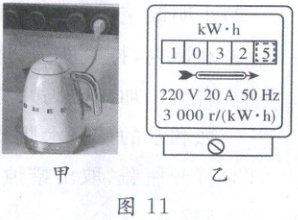 15.(2分)如图11甲是容积为1.5L的电热水壶,装满20℃的水,在标准大气压下将水烧开,导线却不热,说明电流通过导线产生的热量很小,这是因为导线的电阻____(选填“远大于”“远小于”或“等于”)该电热水壶的加热电阻;烧水前电能表的表盘如图11乙所示,若电路中只有该电热水壶工作,此次电热水壶烧水的热效率为70%,水刚被烧开时,该电能表的示数为____kW·h。[ρ水=1.0×10³kg/m³,c水=4.2×10³J/(kg·℃)]
