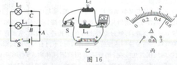 (1)图16乙为小明连接的实物图,则电流表测量的是图甲中____点的电流。小明试触开关,发现两只灯泡不发光,电流表指针大角度偏转,小明把灯泡L₁取下,发现灯泡L₂正常工作,则故障可能是____。