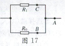 【拓展】完成实验后,小红用两个定值电阻R₀、R₁分别替换图甲中的L₁和L₂,用一可调电压电源替换原来的电池组(未画出),如图17所示。在保证电路安全的情况下,小红用电流表分别测量A、B、C三点的电流,发现电流表的指针有一次满偏,还有一次偏转的角度为满偏的三分之二,已知通过C点的电流大于通过B点的电流,则所有符合上述要求的情况中,通过C点的电流的最大值与最小值之比为