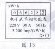 14. (2分)小英家6月底电能表的示数如图15所示,可知她家现在已经接入用电器的总功率为3600 W,则最多还可以连接