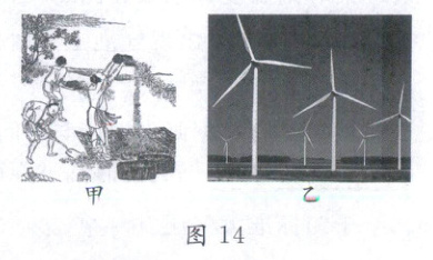 13. (2分)如图14甲为《天工开物》中记载的我国古代劳动人民“扬簸”的场景,“扬簸”是借助自然风将籽粒中较轻的杂物吹走的办法,我国古代劳动人民还利用风能抽水、磨面等,风能是一种清洁无公害的