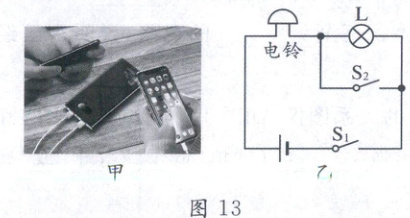 12. (2分)如图13甲所示为一个充电宝同时给两部手机充电,这部充电宝是