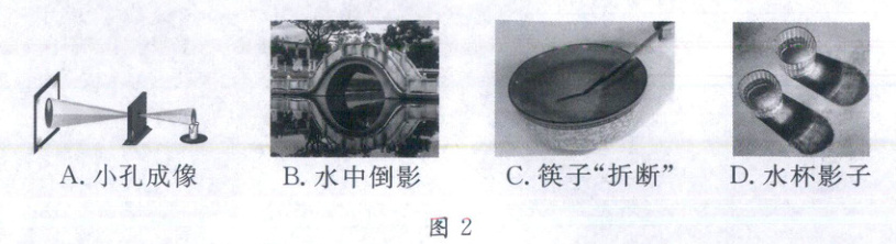4. 古代的《墨经》对光现象就有了记载。如图2的光现象中,由于光的折射形成的是(