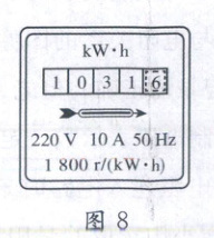 13. (2分)小明家的电能表如图8所示,他要用电能表和秒表测某一用电器的实际电功率。在用电高峰时,他只让规格为“220V 1000W”的电热水壶单独工作,测得在200s内电能表的转盘恰好转81转。此时该电热水壶的实际功率