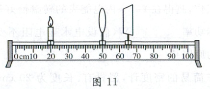 (2)小明在探究凸透镜成像规律的实验中,将焦距为10cm的凸透镜固定在光具座上50cm刻度线处,将点燃的蜡烛放置在光具座上20cm刻度线处,移动光屏至65cm刻度线处,烛焰在光屏上成清晰的像,如图11所示。请回答下列问题: