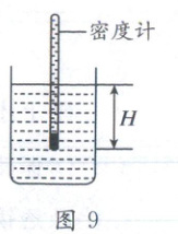 14. (2分)制作简易的密度计,器材有:长度为20cm的吸管一根,铁屑、石蜡、小瓶、记号笔、刻度尺、天平。如图9所示,用刻度尺和记号笔在吸管上标出长度刻度,用石蜡将标0cm的一端封闭,添加铁屑至管内,使其总质量为10g,能竖直漂浮在液体中。(g取10N/kg)当将它放入密度为1.0g/cm³的水中时,浸入的深度为H。若放入密度为0.8g/cm³的酒精中,密度计浸入的深度为______H。为使该简易密度计测量水和酒精的密度时,两条刻度线间的距离大一些,利用现有器材,合理的做法是______。