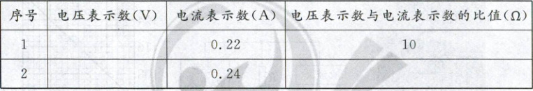 (5)由题图可知,灯的额定电流为0.22A,额定电压不小于3.0V,如果电压表示数与电流表示数的比值等于灯泡的电阻,由表中第1次数据可知,电流表的示数是0.22A,灯泡正常发光,灯泡的电阻是$10\Omega$,灯泡两端的电压$U_L=I_1R_L=0.22A×10\Omega=2.2V<3.0V$,所以电压表没有测量灯泡两端的电压,电压表测量变阻器两端的电压,变阻器两端的电压是2.2V,电源电压不小于$U=2.2V+3.0V=5.2V$,因电源电压为1.5V的整数倍,故电源电压为6V。在第1次实验中,可知灯的额定电压$U_{额}=U - U_1=6V - 2.2V=3.8V$,灯泡的额定功率$P_{额}=U_{额}I_L=3.8V×0.22A=0.836W$。