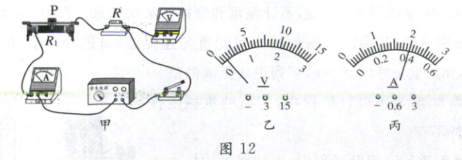 18. (7分)小超同学利用图12甲所示电路探究电流与电阻的关系,电源电压恒定,有5Ω、10Ω、20Ω的定值电阻各一个,滑动变阻器标有“10Ω 1A”。
