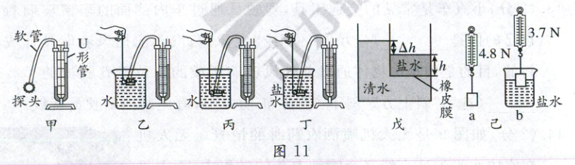 (3)小明设计了图11戊装置来测量盐水的密度,装置内外两个容器紧密粘合在一起,内部小容器的底部为一张弹性很好的橡皮膜,未倒入液体时,橡皮膜保持平整。他设计的实验步骤如下:
