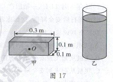 19. (6分)质地均匀的长方体放在水平地面上,密度为1.5×10³kg/m³,边长如图17甲。另有一高为0.35m、底面积为2×10⁻²m²的薄壁圆筒形容器放在水平地面上,容器内盛有0.3m深的某种液体,如图17乙。将长方体由平放变为竖放,长方体对水平地面的压强变化量与液体对容器底部的压强恰好相等。(g取10N/kg)