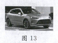 19. (6分)如图13所示是某款油电混动汽车,假如车的总质量为2t,四个车轮与地面接触面积为$8×10^{-2}m^{2}$,纯电模式电动机的输出功率为40kW不变。(g取10N/kg,汽油热值取$4.0×10^{7}J/kg$)求:
