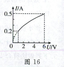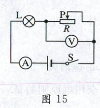 20. (6分)如图15所示,电源电压不变,滑动变阻器R标有“50Ω 1A”,小灯泡L标有“6V 0.5A”字样。闭合开关,当滑片P在某一位置时,电压表示数为2V,电流表示数为0.5A,小灯泡L的I - U图像如图16所示。