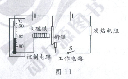 (2)如图11所示,这是一种温度自动控制装置的原理图,制作水银温度计时在玻璃管中封入一段金属丝。闭合开关S后,发热电阻工作,水银温度计示数升高。当示数达到______℃时,控制电路开始工作,电磁铁将衔铁吸起,发热电阻就停止加热。控制电路工作时,电磁铁的右端为______(选填“N”或“S”)极。要增强电磁铁的磁性,请你给出一种可行的方案:______。