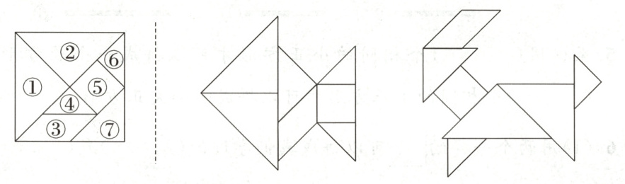 2. 下面右边的两个图案都是用左边的七巧板拼成的,你能在图案上写出每块板的编号吗?试一试吧。(14 分)