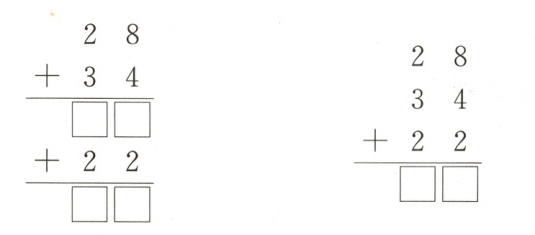 1. 算法算理 亮亮折了 28 个纸飞机,红红折了 34 个纸飞机,聪聪折了 22 个纸飞机,三人一共折了多少个纸飞机?