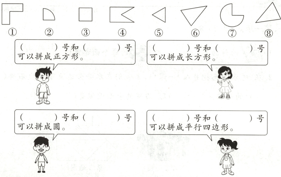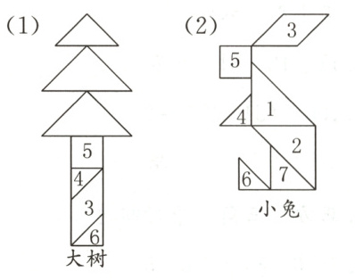 (1)大树图中的树干是由七巧板中3、4、5、6号图形拼成的,请你把它分一分,画一画。