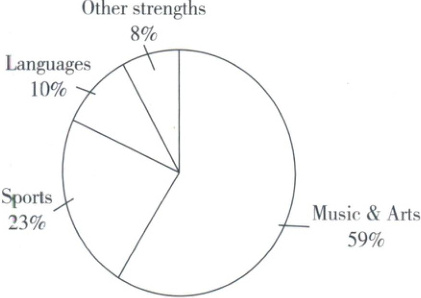 跨学科·数学 The students in Sunshine Middle School want to know students' strengths, so they made a survey. They asked 500 students. Let's see what they are good at. 59% students love music and arts. They join different clubs after school. Playing the piano is the most popular. 23% of the students like doing sports. Boys always love playing soccer and girls enjoy swimming. As for languages, 10% students are good at speaking English. 8% of the students have other abilities. For example, they are good with old people and they love singing and dancing for the old.
