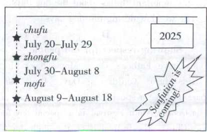 The dog days, also called sanfutian in Chinese, refer to the hottest and most humid days of the year. This hottest period can be different from year to year. It starts in July and lasts for about 30 to 40 days. It has three stages: chufu, zhongfu and mofu. Zhongfu is usually the hottest of the three.