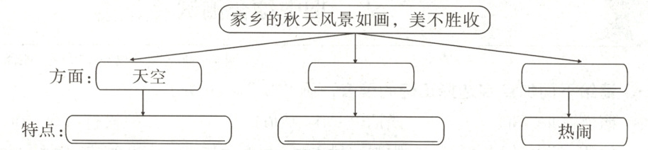 【解析】本题考查整体感知的能力。短文是总—分结构,第①自然段总写家乡的秋天风景如画,美不胜收,第②~④自然段分别从家乡的天空、树林、田野三方面展开描述。结合第②~④自然段的第1句话可找到答案,据此填写即可。