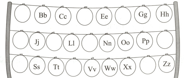 五、下面是学校聚会上的字母气球墙,有些气球上的字母贴纸不见了。请你按照字母表顺序,写出所缺字母的大小写形式。(10 分)