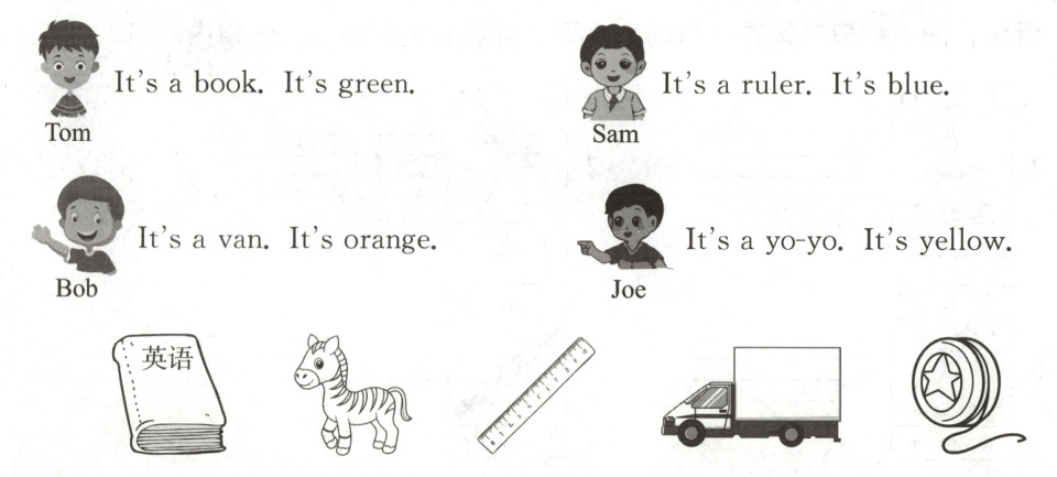 把书涂成绿色;把直尺涂成蓝色;把货车涂成橙色;把悠悠球涂成黄色。