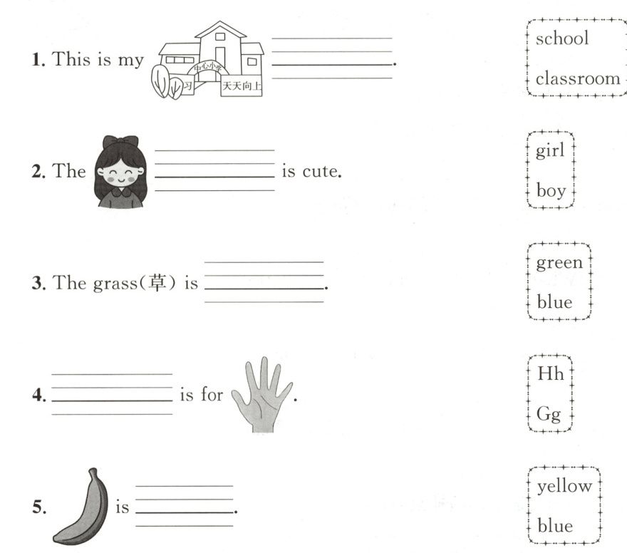 1. school school 2. girl girl 3. green green 4. Hh Hh 5. yellow yellow