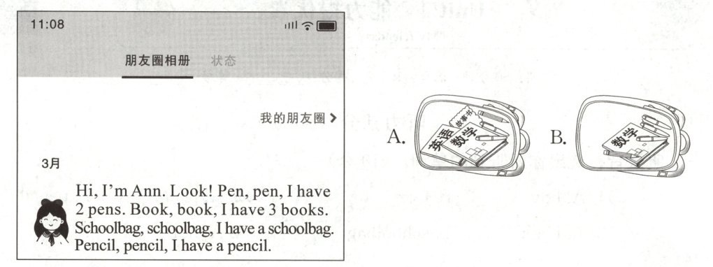 )3. Peipei and Qiqi have three pencils in all(总共).任务二:根据材料内容,为下面的书包找到它们的主人,将序号写在横线上。(2分)