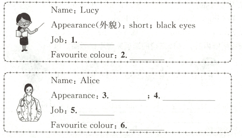 Lucy and Alice are my friends. Lucy is a girl. Alice is a girl,too. Lucy is short. Alice is tall. Lucy is a teacher. Alice is a doctor. Lucy’s favourite(最喜欢的) colour is blue. Her eyes are black. Alice’s favourite colour is green. Her eyes are black,too.
