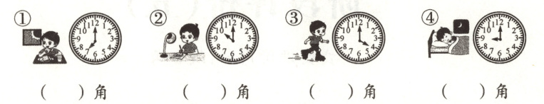 (1) 钟面上的时针和分针形成的各是什么角?填在上面的括号里。(4分)