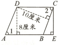)个。①平行四边形$ABCD$的$BC$边上的高是10厘米;②$CE = 8$厘米;③四边形$AECD$是一个直角梯形;④$\angle 1 = \angle 2$。