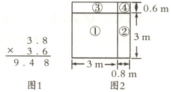 5. 丽丽的房间(如图)长 $3.8m$,宽 $3.6m$,她列竖式算面积(如图1),结合两图中的信息,可以发现,她少算了(