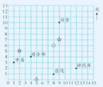 食堂$(8,6)$用○标出,粮仓$(9,7)$用☆标出,岗哨$(5,0)$用△标出,敌军司令斋藤住所$(2,5)$用◎标出。
