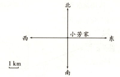 以小芳家为原点建立方向坐标系,1cm代表1km。