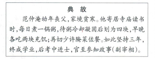 “划粥断齑”中“齑”的大致意思为①____;该成语形容生活极度清贫,也暗含②____的精神。