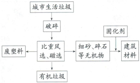 16.首先需将城市生活垃圾进行破碎,再 通过比重风选和磁选的方式,将破碎的 垃圾分为废塑料、有机垃圾和细砂、碎 石等无机物。其中细砂、碎石等无机物 可加入固化剂,变成建筑材料。
