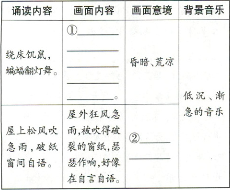 1.①昏暗的屋内,饥饿的老鼠绕着床奔走觅食,蝙蝠围着昏暗的油灯上下翻飞 ②破败、孤寂(填“荒凉、凄凉、孤独、伤感”等亦可)