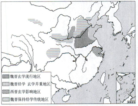 选择B:以“六经”为主要研究对象的经学属于传统儒学,而以老庄无为思想为核心的玄学在魏晋时期得到发展。从材料来看,玄学在河洛地区发展较早,西晋时期影响到了江东地区,而保持经学传统地区相对萎缩,说明魏晋南北朝时期以经学为代表的传统儒学受到冲击。魏晋保持经学传统地区主要集中在少数民族内迁地区附近,如1号为匈奴、羯;2、4号为羌、氐;3号为鲜卑,说明少数民族吸收汉文化。山东地区是传统经学士族聚居的地区,但是玄学在当地的影响不断增强,体现了儒学遭遇了挑战和冲击。5号、6号为魏晋玄学影响较大地区,属于中原、江东地区,是经济文化较发达的地区。排除A:玄学思潮的产生与当时儒学呈衰落之势和黄老思想进一步发展有关,与当时的民族交融无关。排除C:魏晋南北朝时期,北方常年受战乱影响,经济并不繁荣,但从材料看玄学和经学在北方的影响范围仍然很广。排除D:文化重心随经济重心变动,魏晋南北朝时期南方经济虽得到开发,但经济重心仍在北方。