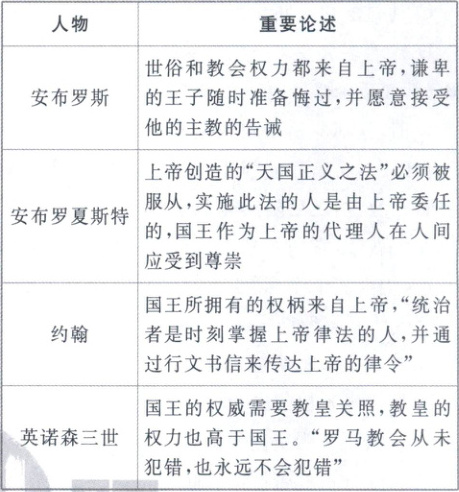 5.C 【解析】本题考查中古欧洲文化。选择C:根据材料可知,安布罗斯提出世俗权力需服从主教告诫,安布罗夏斯特将国王定位为上帝代理人,约翰指出国王权柄来自上帝并传达上帝律令,英诺森三世则直接宣称教皇权威高于国王且教会永无谬误,这些论述的核心是突出教会在中世纪西欧社会中的至高地位。排除A:材料强调的是教权与王权的关系,未体现封建等级的具体分层。排除B:权力制衡强调双方互相制约,而材料中强调教权压制王权。排除D:二元并立指两种权力平等分立,但材料突出的是教权凌驾于王权之上,并非对等关系。