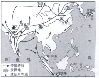 7.B 【解析】本题考查佛教的兴起与传播。选择 B:根据地图可知,图中传播路线以印度为中心,经中亚地区到达东亚中国和朝鲜半岛等地,南下传播到中南半岛,符合这一特征的历史事件是佛教的产生与传播。排除 A:匈奴起源于北方草原地区,不是印度地区。排除 C:海陆丝绸之路的起点与传播路径和图中从印度出发的路线不符。排除 D:咖啡的传播路线应包括非洲和美洲,材料并未体现。
