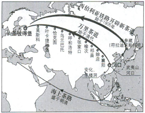 3. [天津一中 2024 月考]下图为 17 世纪中俄形成的万里茶道示意图,茶道沿线的码头、镖局、客栈、饭庄、货场、会馆、骡马舟船、搬运行帮、票号蓬勃发展。由此可知,万里茶道使得(