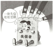 (4)示例:该漫画中有一位“失信者”被禁锢了四肢,右上方有四只写着“联合惩戒”的手指向“失信者”,左上方标注有“一处失信,处处受限”的字样。该漫画的寓意:一个人若失信,生活中将处处受限制。