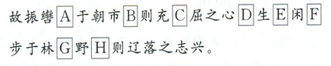 9.BEH 【解析】本题考查文言文断句的能力。“振辔于朝市”和“闲步于林野”结构相似,均独立成句;“则充屈之心生”和“则辽落之志兴”结构相似,均独立成句。故在B、E、H三处断开。